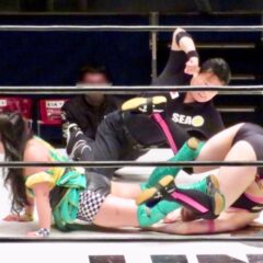 「硬くて重いものが仕込まれている」という疑惑のシューズで顔面を蹴りフォールを奪う。