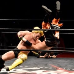 ヒロムロール相手をエビ固めの体勢で丸め込むときに、片足も使って抑え込む。