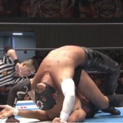 ヒロムロール相手をエビ固めの体勢で丸め込むときに、片足も使って抑え込む。
